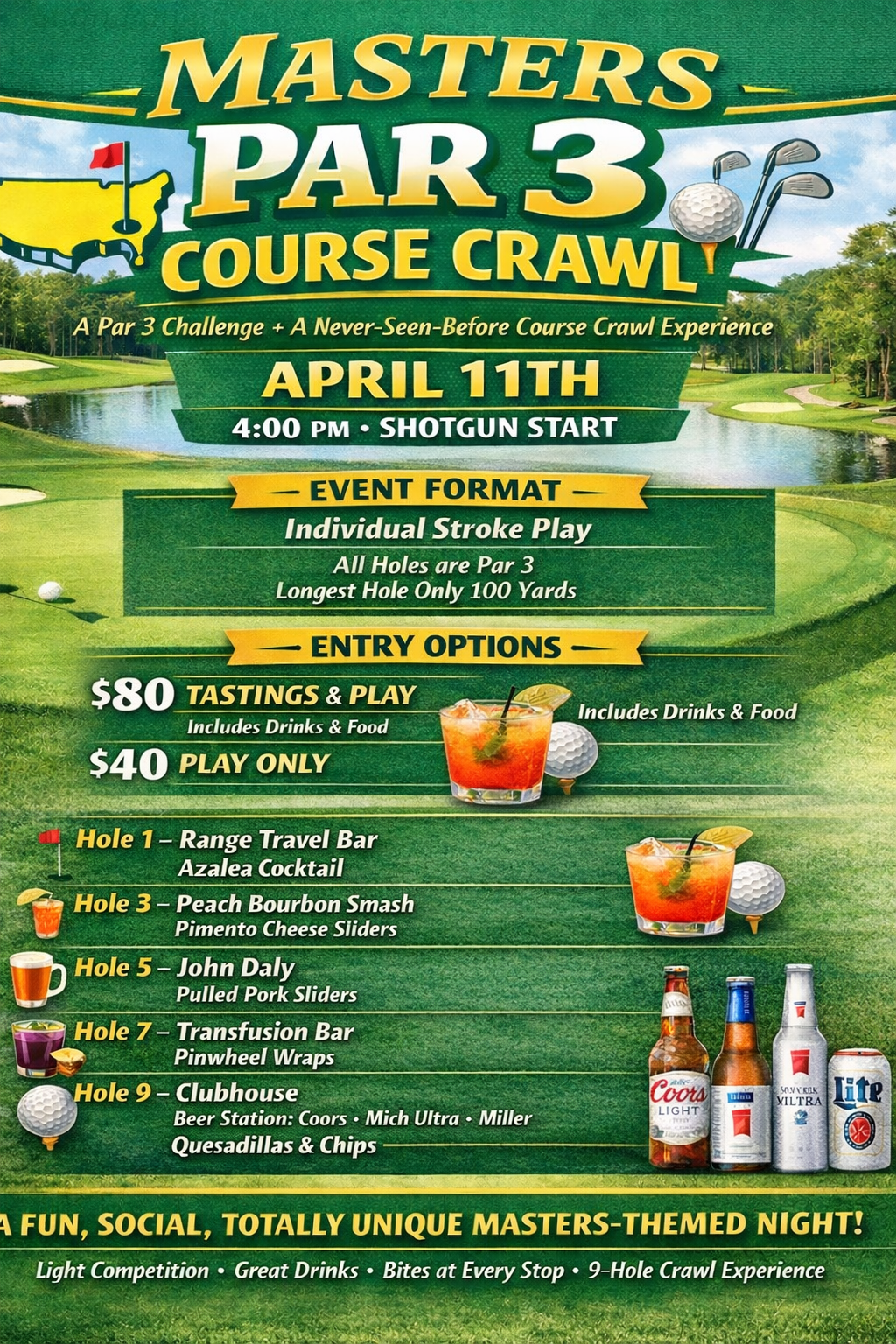 Join us for a one-of-a-kind Masters-inspired night featuring a 9-hole Par 3 challenge + course crawl experience!